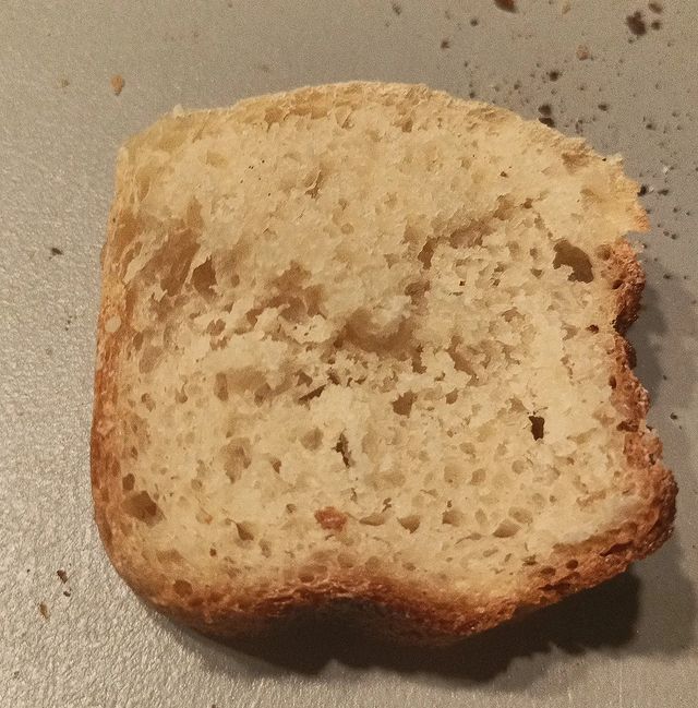 Préparé en moins d’un quart d’heure, cuit en à peine 30 minutes : 7 minutes à feu vif et le reste à feu doux. Entre la préparation et la cuisson, 5 heures de maturation de la pâte. Le pain est léger, avec une mie bien moelleuse mais un peu dense, une croûte fine et croustillante. Ceci-dit, je pense qu’il me faudra encore quelques essais avant d’obtenir exactement ce que je veux.